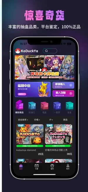 KoDuckYa - Trading Card & Pop Figure Blind Box Store: A community where enthusiasts of TCG cards and pop figures gather. Beyond blind boxes and ichiban-sou, KoDuckYa aims to create an engaging platform for acquiring, collecting, and sharing favorite items. Key Features of the KoDuckYa App: 【New User Benefits】New users receive a discount coupon upon login! 【Monthly Spending Rewards】Monthly free rewards for spending! 【Referral Bonuses】Invite new users and earn rebates when they make purchases! 【Professional Quality Control】Every TCG card is verified by the platform—100% authentic! 【Interactive Community】A fun space built for users to connect and share! 【More Fun Gameplay】Endless game modes bring you double the joy! Open boxes online—experience the thrill of unboxing from home. Share with friends now and enjoy the surprise together. Customer Service Hotline: Contact KoDuckYa’s online customer service directly, or add our official WeChat to claim a big gift package. (This event is not affiliated with Apple Inc.)