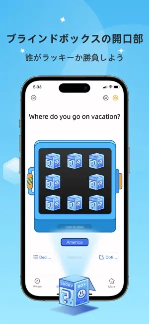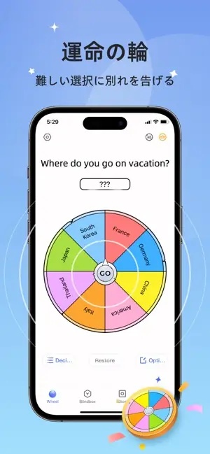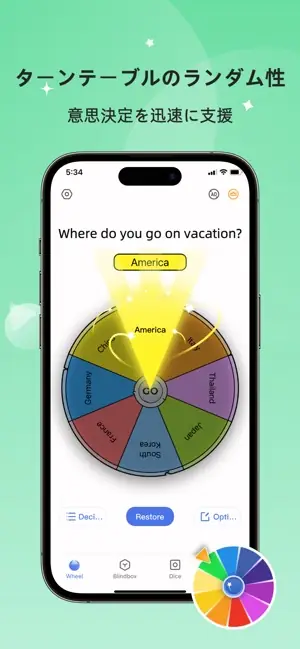 Choose your difficulty level with a lucky star A must-have for party games Team-building games are no longer boring Customizable decisions and options - Truth or Dare? - What’s for lunch? - What should I wear tomorrow? - Where should we go on vacation? Main Features - Wheel of Destiny - Surprise Unboxing Blind Box - Happy Dice Roll - Jump Challenge It's all up to me to help you make your choices Spin the turntable and randomly remove blind boxes Extremely simple and incredibly easy Subscription Service: 1. Payment: Weekly or annual subscription. Payments are charged through the user's iTunes account after purchase confirmation. 2. Renewal: The user's iTunes account will be charged within 24 hours before the subscription expires, adding the corresponding subscription cycle. 3. Cancel Subscription: To cancel, access the "App Store", click on "App ID", go to the "Account Settings" page, click "Subscriptions", and select "Cancel Subscription". 4. Privacy Policy: http://static.yuanfengzi.com/html/privacy/10165189060714217288_ios.html?appName=小さな決断が大きなターンテーブル 5. Terms of Service: http://static.yuanfengzi.com/html/usagreement/general.html