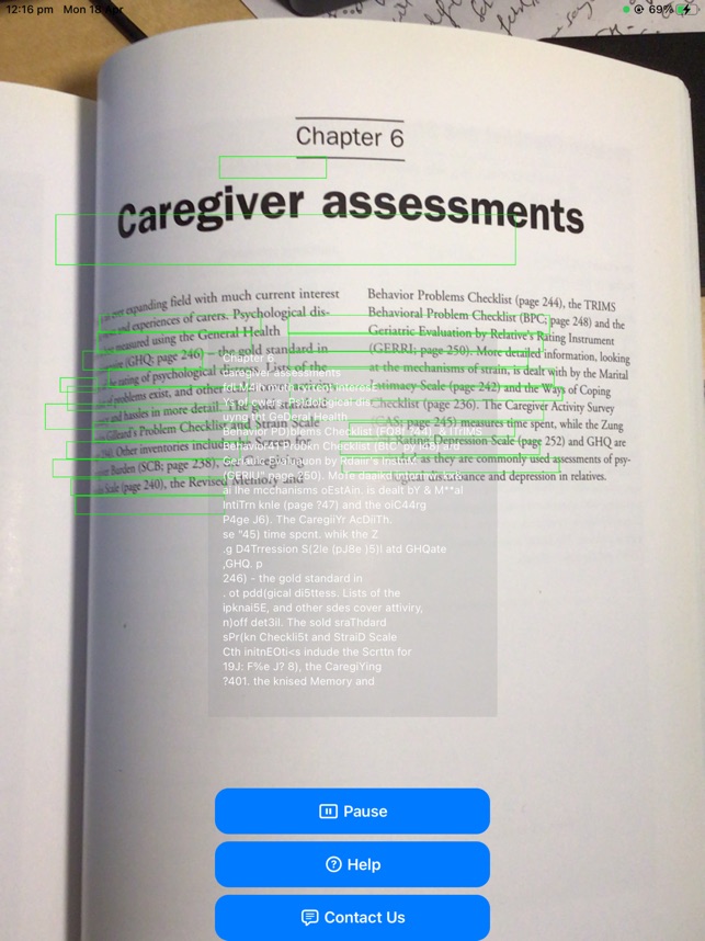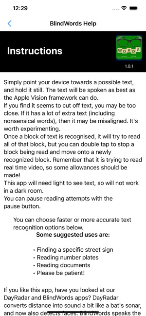 BlindWords converts real time camera pictures that contain text into spoken words. It is not perfect but it can help read text for people who cannot see the text. Double tapping re-loads new text. There is a pause feature and help text to describe how to use it. It can read signs in the street and text in a book (using the set voice). It can also be used by those with blurred vision who can see pages but not the individual words. All suggestions on how to improve it are welcome. Thanks to Apple for creating the Vision framework which underlies the functionality.