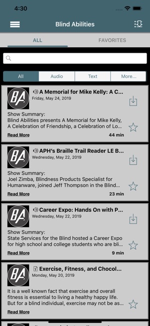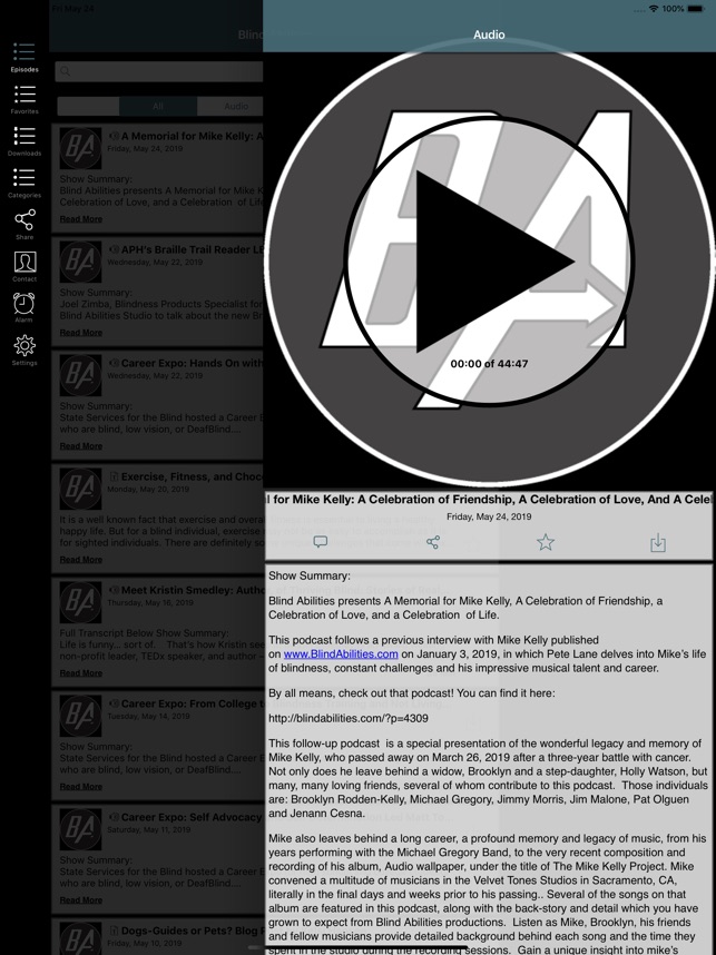 blind Abilities produces podcasts and blogs dealing with accessibility, technologies, devices and enhancing the opportunities in the job market for the Blind, visually Impaired and DeafBlind. We interview developers, users and advocates in the field of Blindness. Blind Abilities is a community of Blind, DeafBlind and Low vision members sharing experiences and offering advice when needed. Together we share each other’s vision to bridge the gap between the limited expectations and the Realities of Blind Abilities. Our Teen Cast podcasts focus on promoting successful transitioning from high school to college and employment. Life Skills and everyday living categories is part of our mission to enhance the self-confidence to reach one’s higher expectations in all aspects of living with Blindness. With this app you are always connected to the latest episodes and the show. Quickly star episodes and save them to a list so you can easily enjoy them over and over! This app has a Car mode too! Rotate your phone to display larger playback controls. It is the best and most convenient way to access Blind Abilities. This app contains the following features: * Car mode,rotate your phone to display larger playback controls * Streaming access to play episodes from anywhere * Always updated with the latest episodes- and an archived back catalog * Playback resume (when interrupted by a call or other distraction) * Quick access to all the contact methods for the show like call, email, web, Facebook, and Twitter * Playback controls like continuous play, Speed 1x, Repeat Off, and Sleep Timer