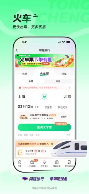 2. Train Tickets: Convenient booking with online抢票 (抢票 means 'grabbing tickets') and seat selection; diverse ticket types including adult, child, and student tickets; smart travel recommendations such as transfer suggestions, buying multiple stops, and same-train transfers for optimized journeys.